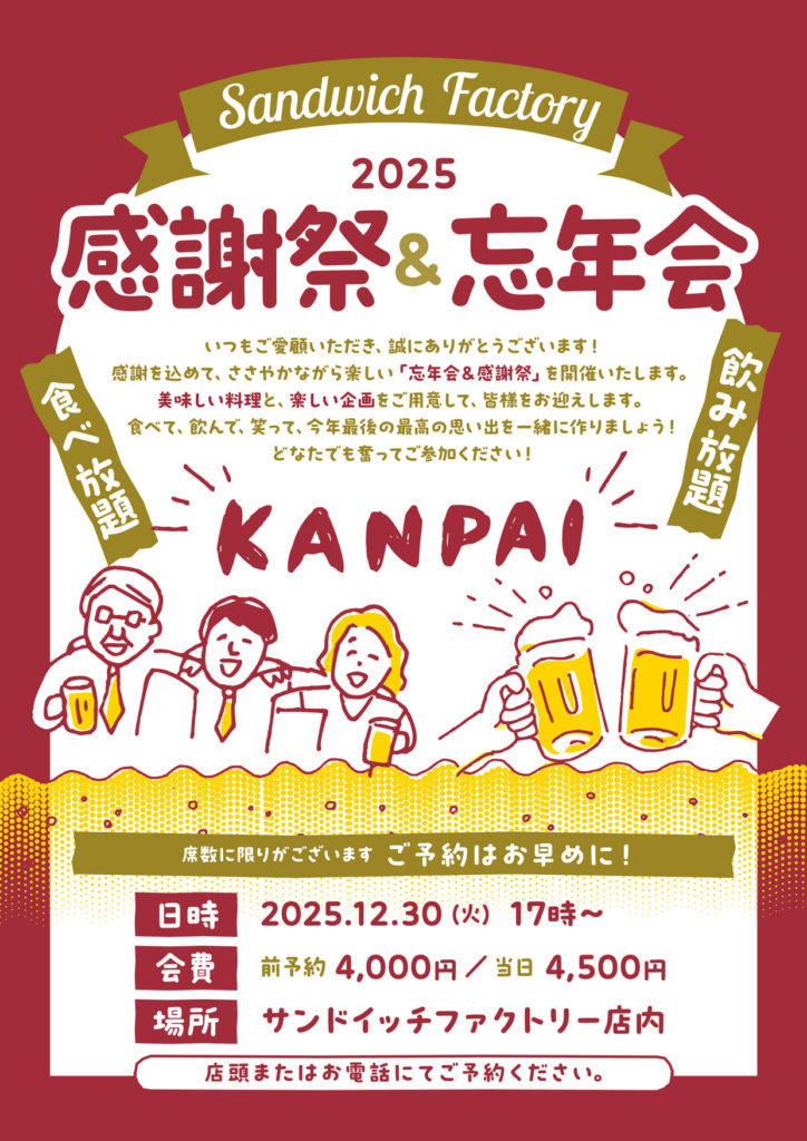 12月30日(火)の17時から、当店で感謝祭&忘年会を開催します!